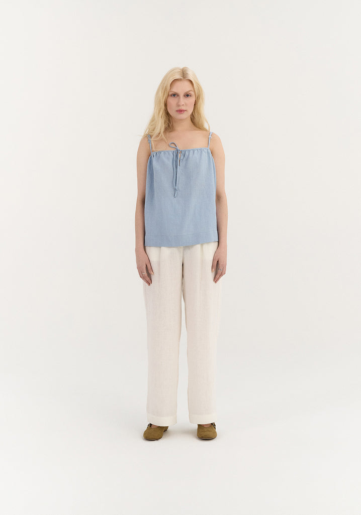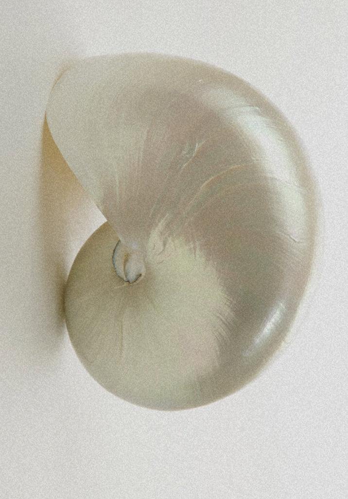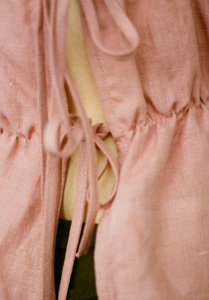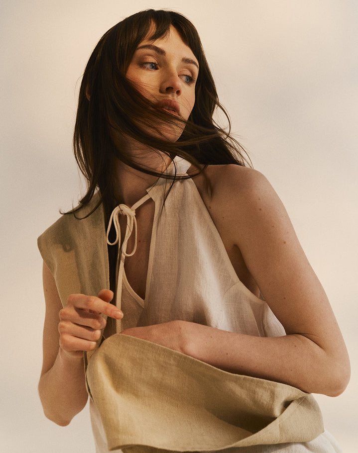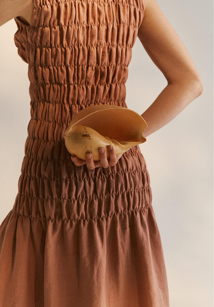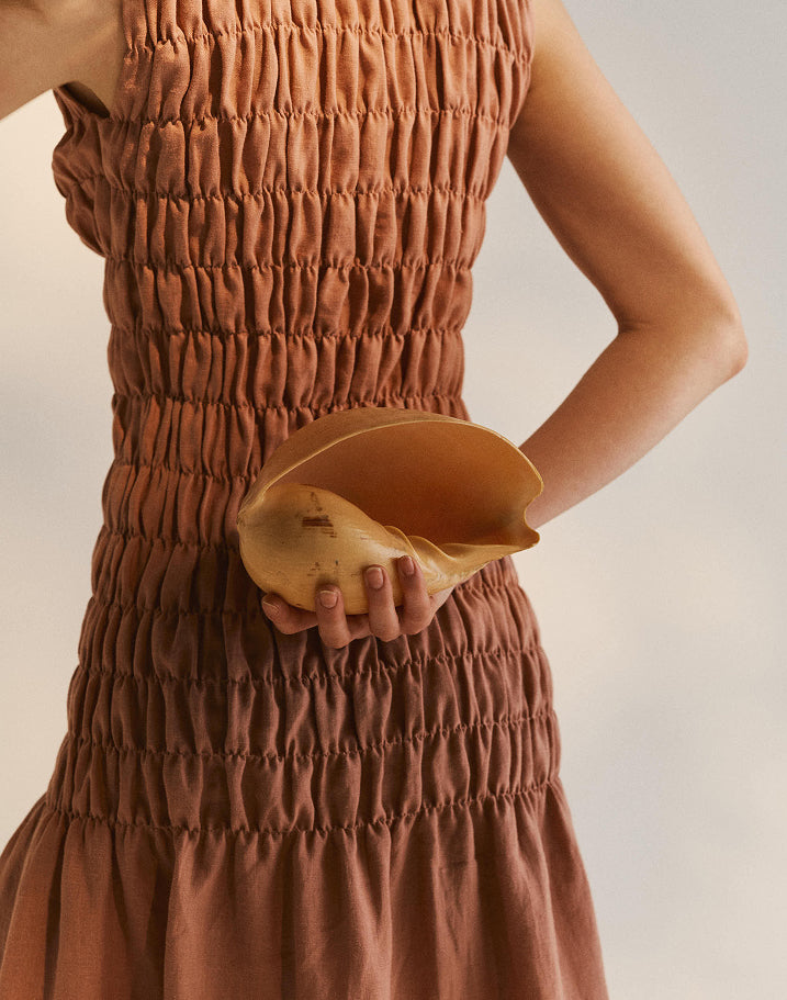 The details follow the same logic: gathered fabric that echoes shell ridges and sea ripples, mother-of-pearl buttons that catch the light like something found on a shore, ties and open backs that feel hand-fastened, slightly undone. Silhouettes are clean but never rigid. Soft folds, fluid shapes, linen that moves with the body and settles without effort.