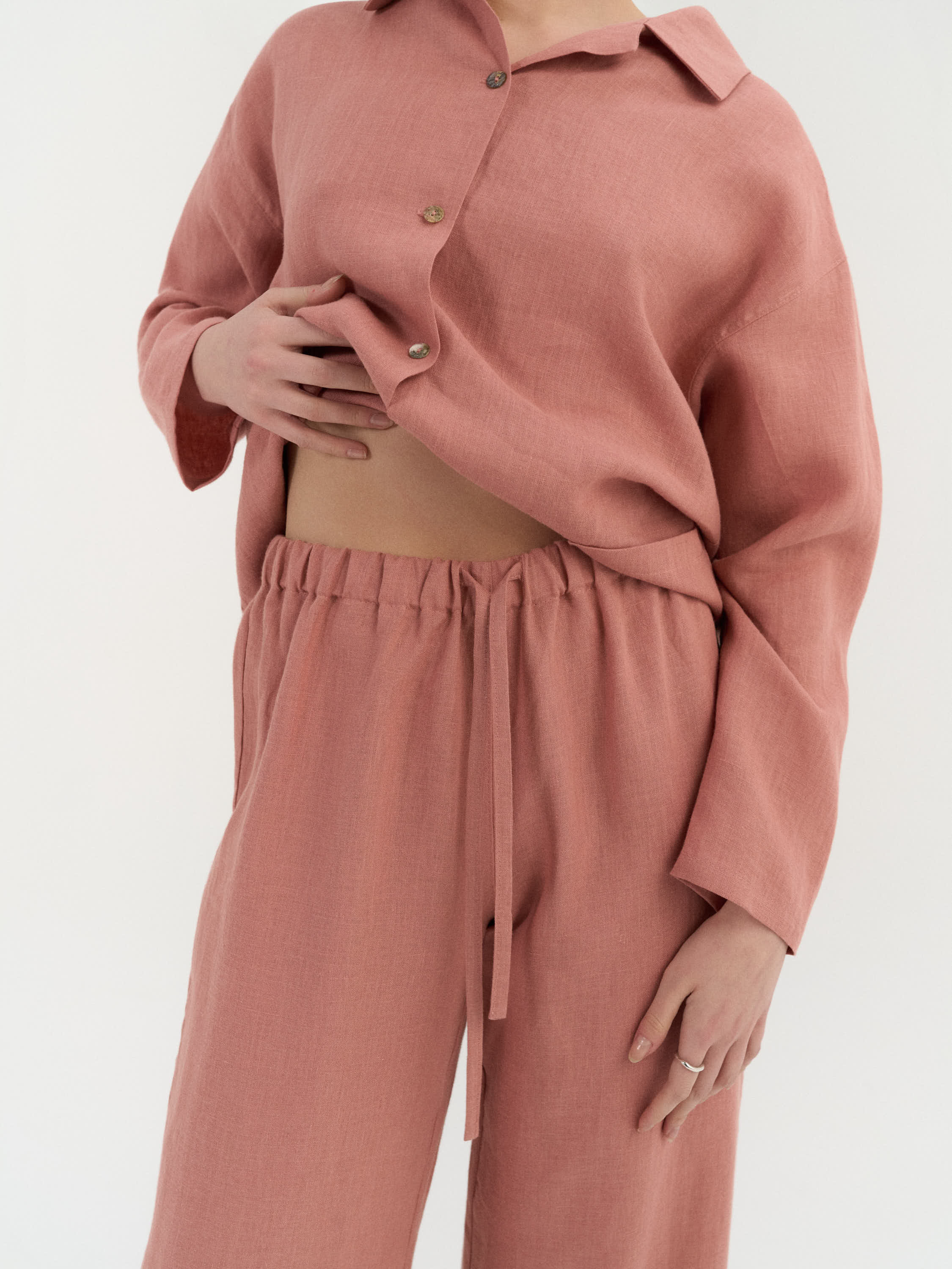 A relaxed two-piece linen pajama set designed for everyday comfort. The shirt features a button-down front with a simple collar and two front pockets, offering a practical, easy-to-wear shape. The matching pants are finished with an elastic waistband and adjustable drawstring, with a smooth, pocket-free design for a clean, uncomplicated fit.